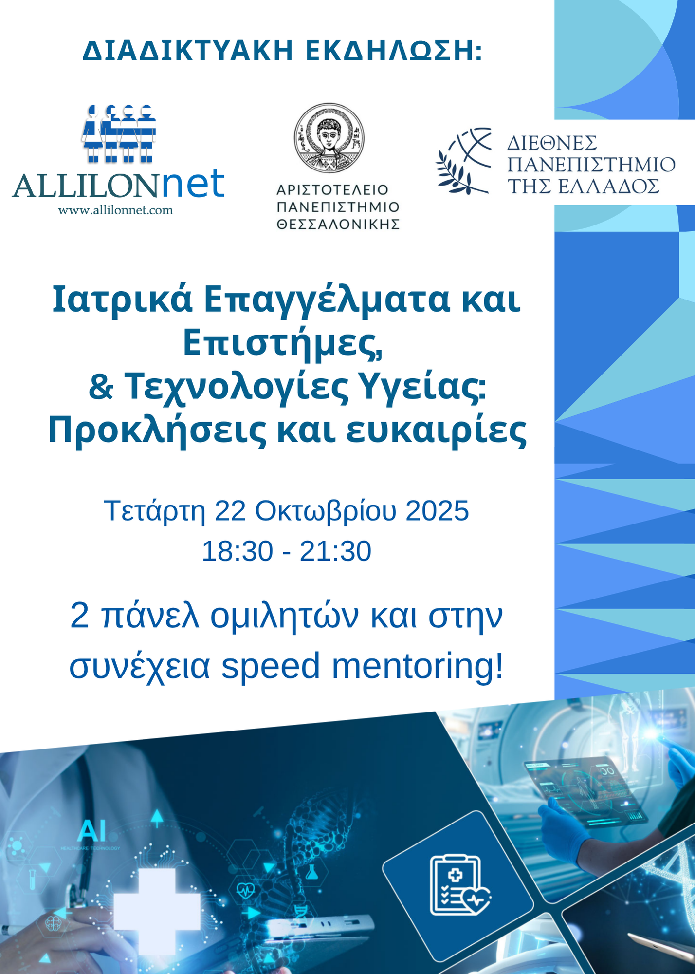 Το θέμα της εκδήλωσης είναι: «Ιατρικά Επαγγέλματα και Επιστήμες και Τεχνολογίες Υγείας: Προκλήσεις και ευκαιρίες», και θα πραγματοποιηθεί την Τετάρτη 22 Οκτωβρίου 2025 (ώρα Ελλάδας 18:30 με 21:30).