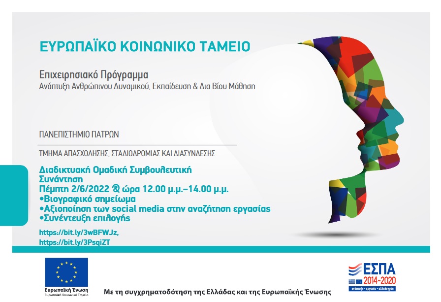 Στο πλαίσιο της Πράξης «Γραφείο Διασύνδεσης Πανεπιστημίου Πατρών», το Τμήμα Απασχόλησης, Σταδιοδρομίας και Διασύνδεσης, της Διεύθυνσης Εκπαίδευσης και Έρευνας, θα υλοποιήσει, την Πέμπτη 2 Ιουνίου 2022 και ώρα 12.00 μ.μ. – 14.00 μ.μ., διαδικτυακή Συμβουλευτική Επαγγελματικού Προσανατολισμού, για απόφοιτες/τους του Πανεπιστημίου Πατρών.