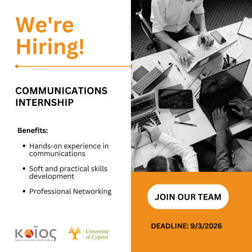 The KIOS Research and Innovation Center of Excellence (www.kios.ucy.ac.cy) at the University of Cyprus invites applications for one (1) part-time Communications Intern. This opportunity is open to both undergraduate and postgraduate students in Communications, Marketing, Journalism, or other related fields. The selected candidate will gain hands-on experience in communications, actively contributing to the Center’s communication initiatives and building practical skills in the field.